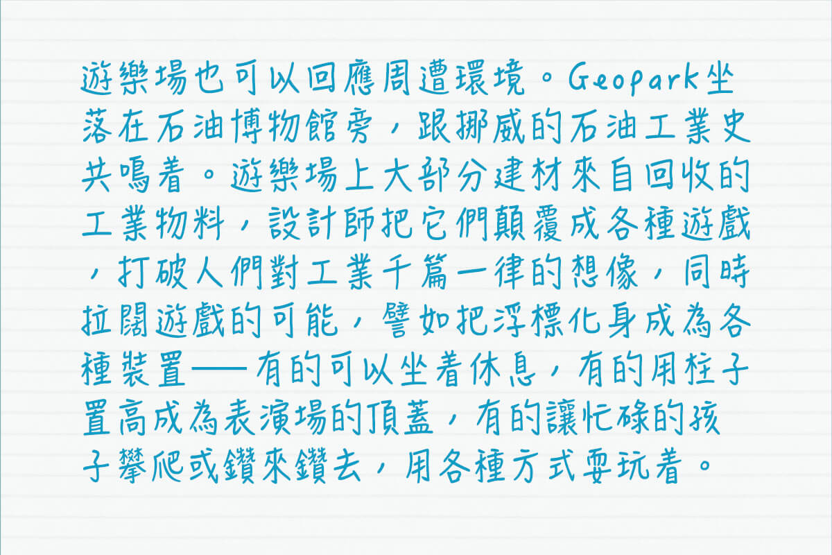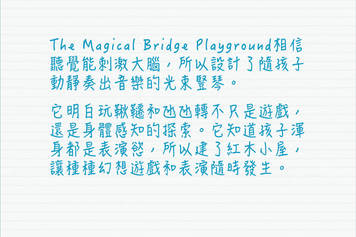 好的遊樂場該包含一系列體驗元素,包括刺激感官發展、社交互動、提供想像空間,和融入周遭的自然環境等。孩子可以扮演各種角色,也可以主導自己的遊戲,絕對不只是一組爬上滑下的遊樂設施。空間再小,也可以豐富。