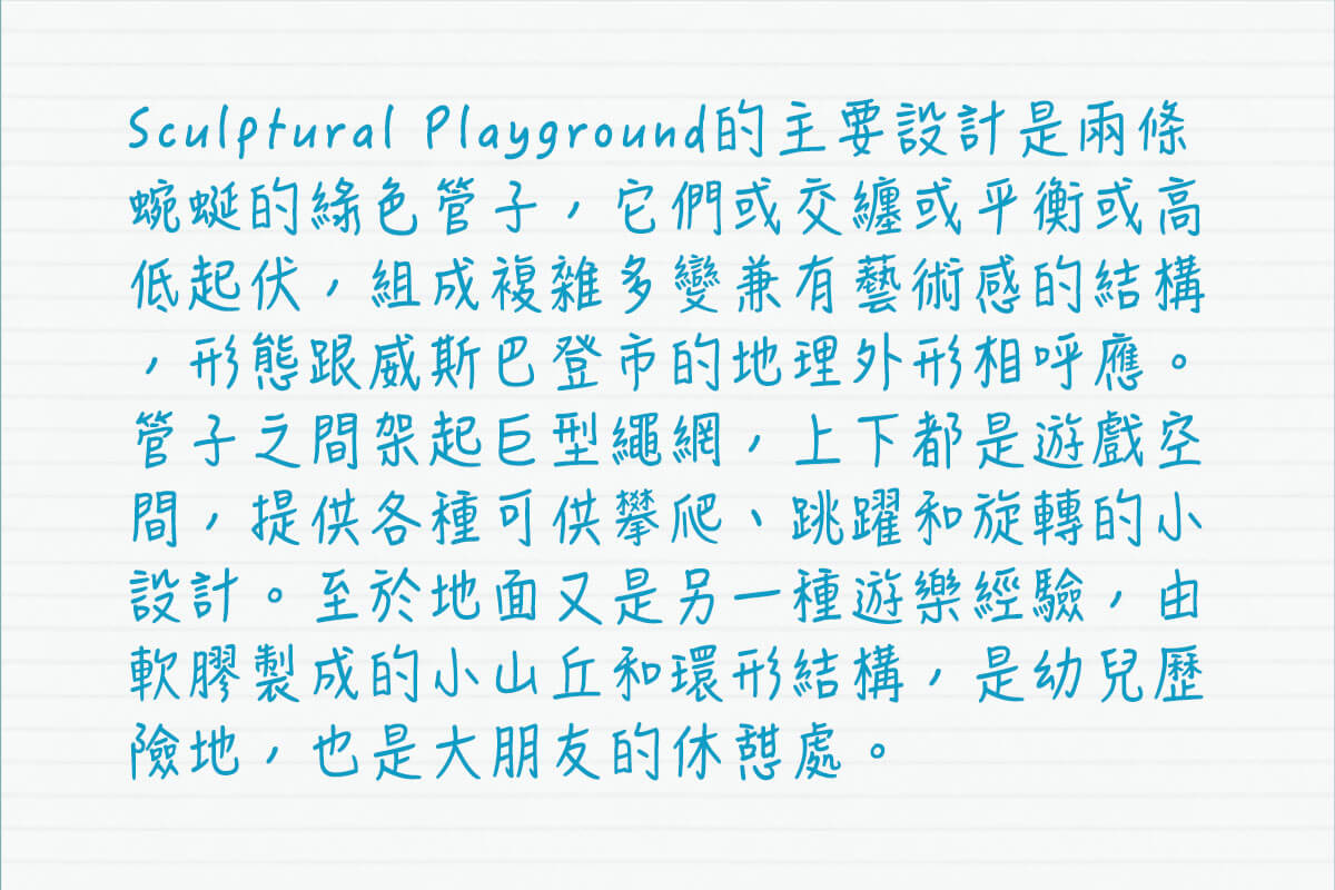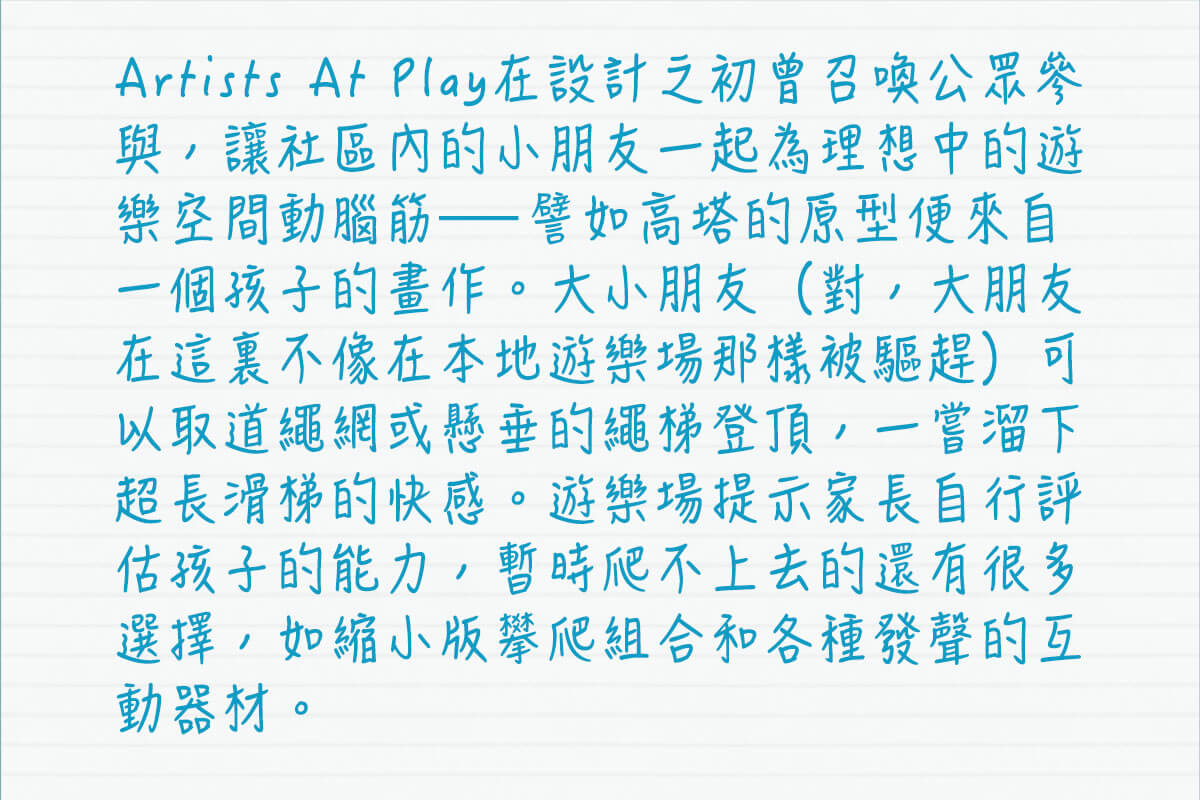 香港的遊樂場,反映了政府想把孩子都留在指定地方玩,為了自己方便,所以到處放相同的東西,他們關心維修多於真正的遊戲。