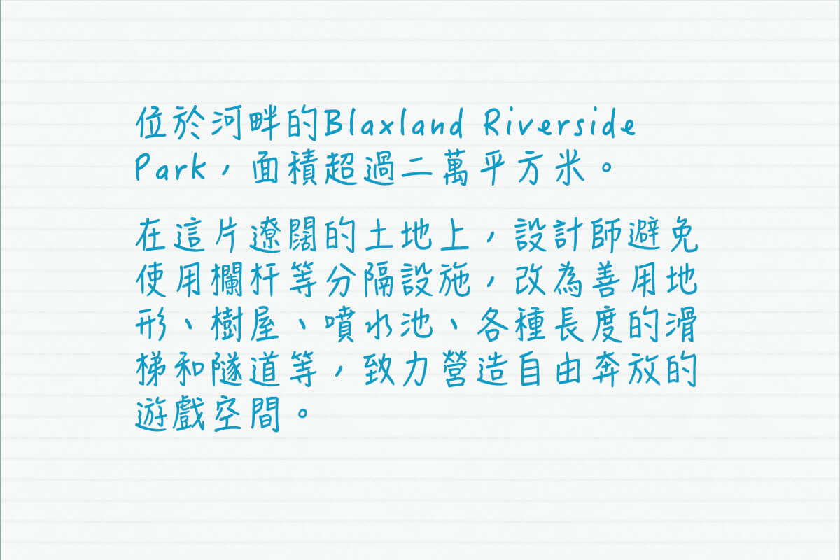 Susan:某年我在海洋公園看到一個大型噴水池,在美英等地那種地方定必好玩透頂,孩子會跑進去弄濕自己。但人們告訴我,香港人才不會那樣。我在香港幾乎找不到能挖沙和玩水的遊樂場,沒有大自然元素。這樣確實不會弄髒,但孩子本來就該玩得髒兮兮,現有的遊樂環境顯然不足。