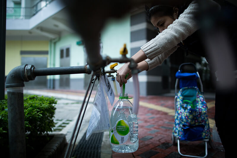 食水含鉛影響下,啟晴邨居民到臨時取水點取水使用。攝:盧翊銘/端傳媒